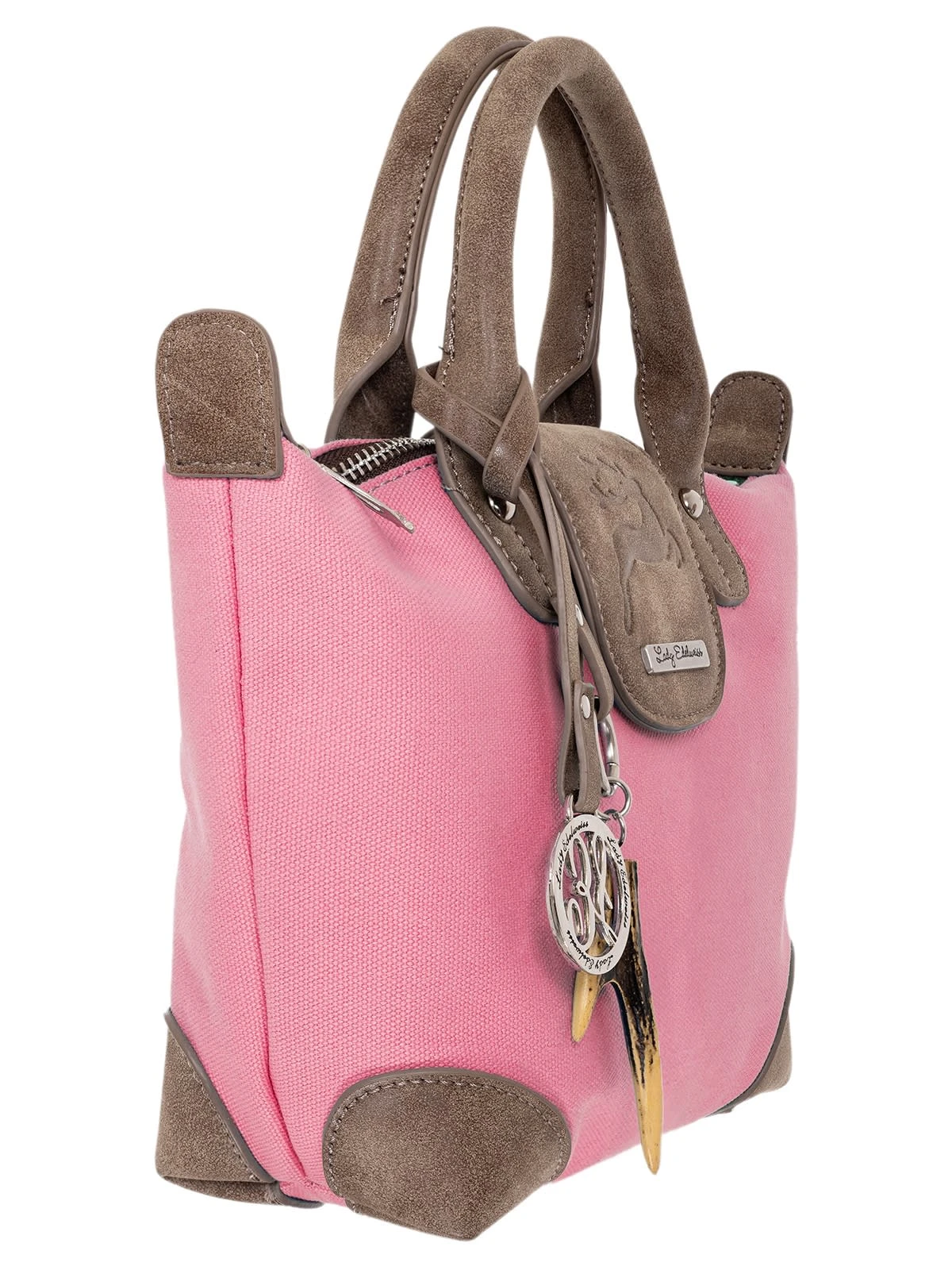 Trendige kleine Trachten Tasche. Die Tasche von Lady Edelweiss wurde farblich in einem schönen rosa gehalten welches sich zu dem braunen Griff und der braunen Lasche gut absetzt. Die Ecken wurden mit Kunstleder und 4 Nieten für den besseren Stand versehen. Die Tasche ist trotz der Größe geräumig und hat ein Innenfach mit Reißverschluss.•Kunstleder/Polyurethan, ca. 21x 29 x 9,5 cm, Magnetverschluss, 1 Reißverschlussfach, 1 Steckfächer,