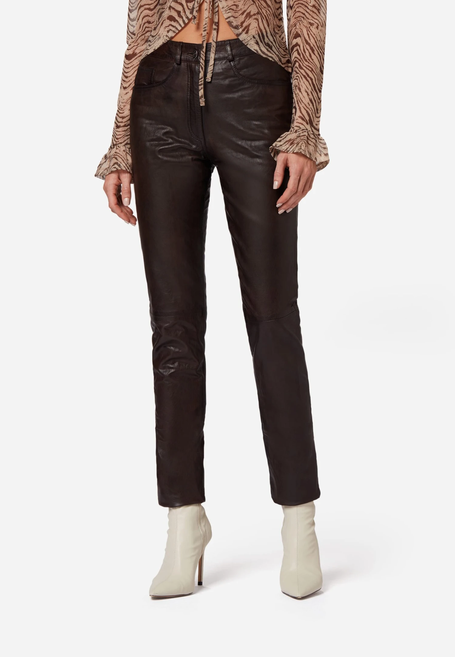 Lederhose 9809 in Braun für Damen von Ricano® aus Lamm-Nappa Leder – Regular Waist / Medium Rise – Femininer und figurbetonter Slim Fit – Futter: 100% atmungsaktives Polysatin – Ganzjahresartikel – von Frühling bis Winter zu jeder Jahreszeit passend – Größenausfall: Artikel fällt eine Nummer kleiner aus – Bitte eine Nummer größer wählen als gewohnt – Italienisches Fitting. Enthält nichttextile Bestandteile tierischen Ursprungs.