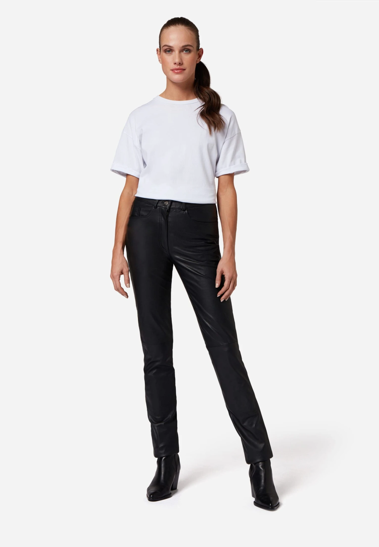 Lederhose 9809 in Schwarz für Damen von Ricano® aus Lamm-Nappa Leder – Regular Waist / Medium Rise – Femininer und figurbetonter Slim Fit – Futter: 100% atmungsaktives Polysatin – Ganzjahresartikel – von Frühling bis Winter zu jeder Jahreszeit passend – Größenausfall: Artikel fällt eine Nummer kleiner aus – Bitte eine Nummer größer wählen als gewohnt – Italienisches Fitting. Enthält nichttextile Bestandteile tierischen Ursprungs.
