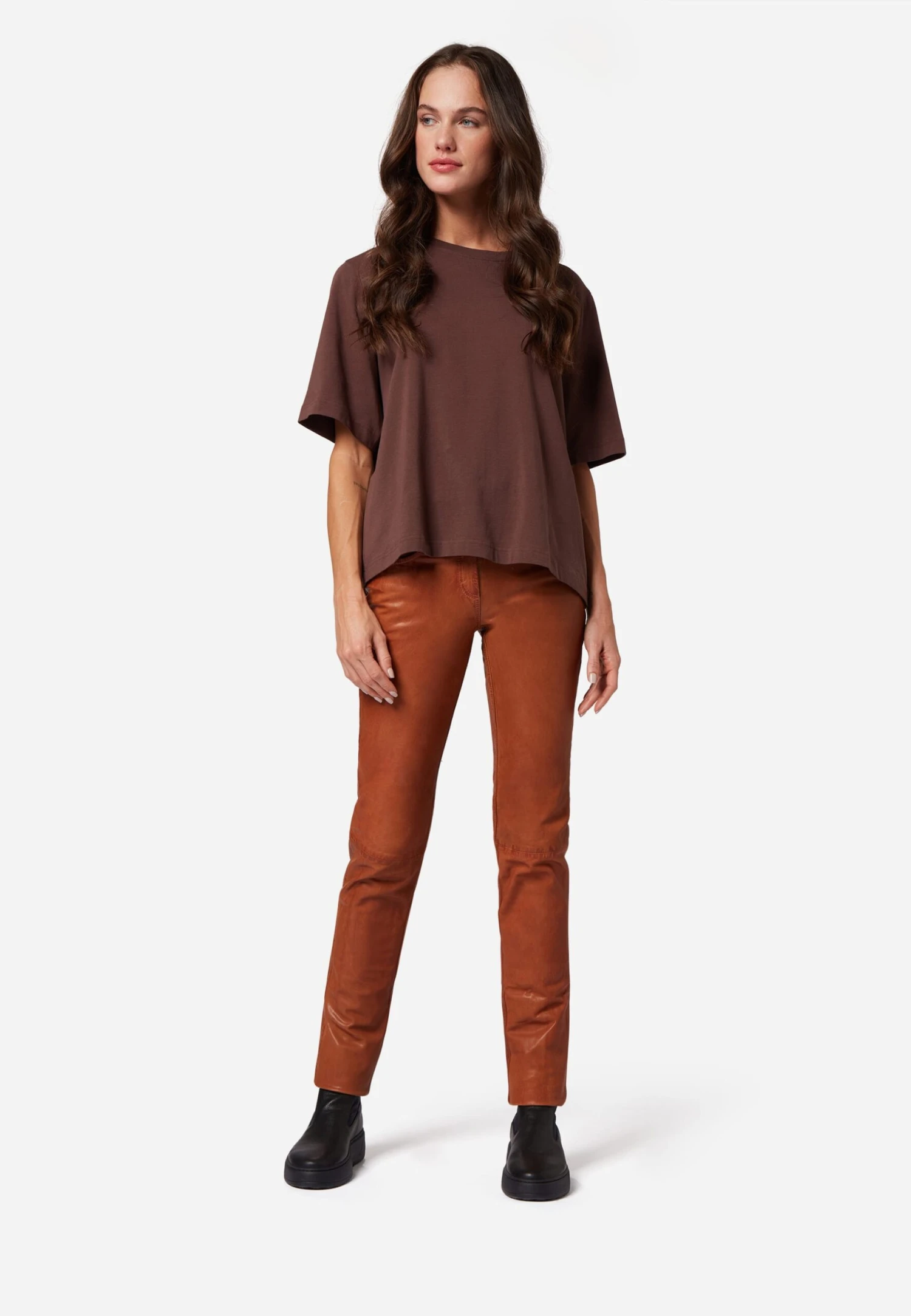 Lederhose Dorin in Cognac Braun für Damen von Ricano® aus Lamm-Nappa Leder – 5-Pocket-Stil – Low Waist – auch Hüfthose genannt – Femininer und figurbetonter Slim Fit – Futter: 100% atmungsaktives Polysatin – Ganzjahresartikel – von Frühling bis Winter zu jeder Jahreszeit passend – Größenausfall: Artikel fällt eine Nummer kleiner aus – Bitte eine Nummer größer wählen als gewohnt – Italienisches Fitting. Enthält nichttextile Bestandteile tierischen Ursprungs.