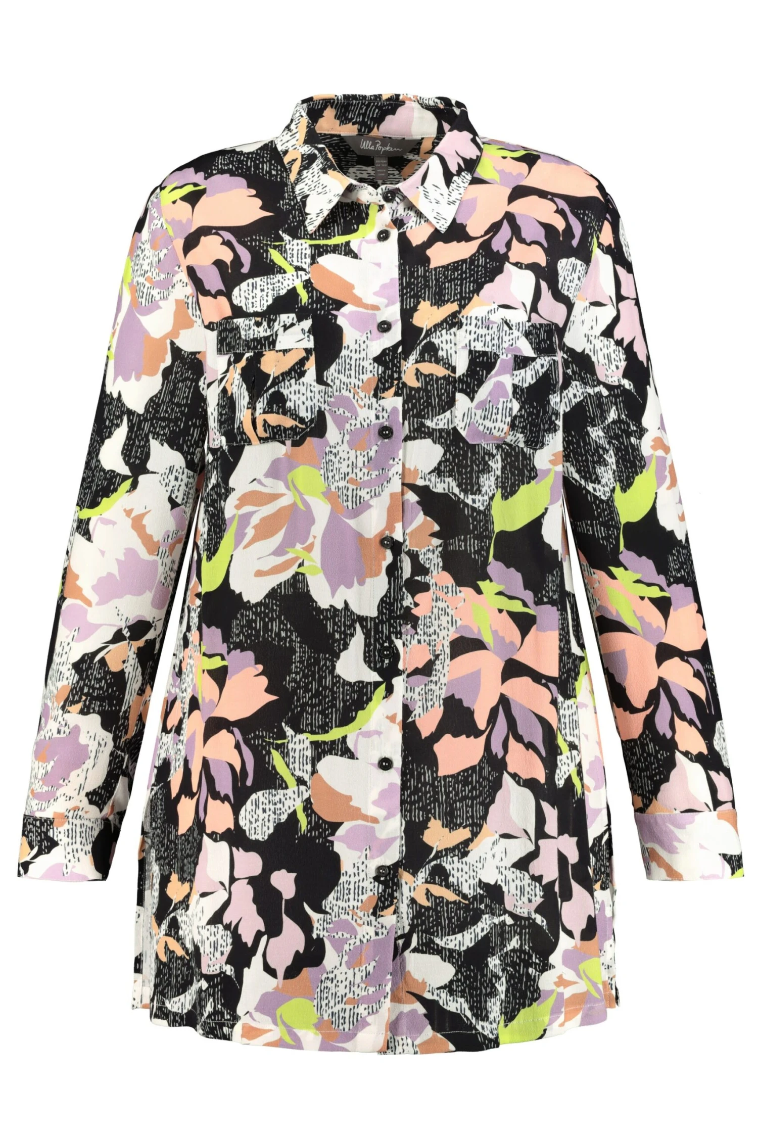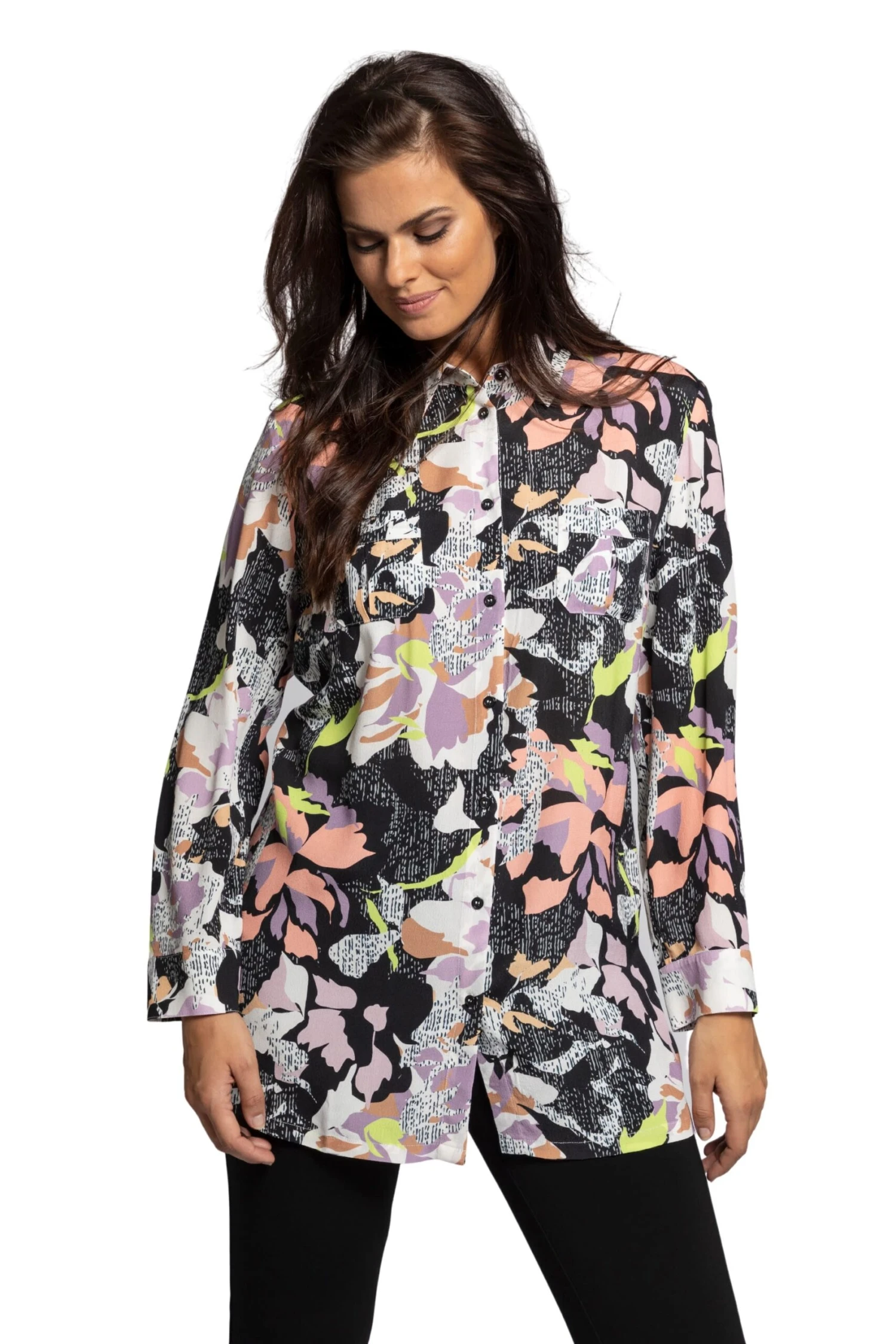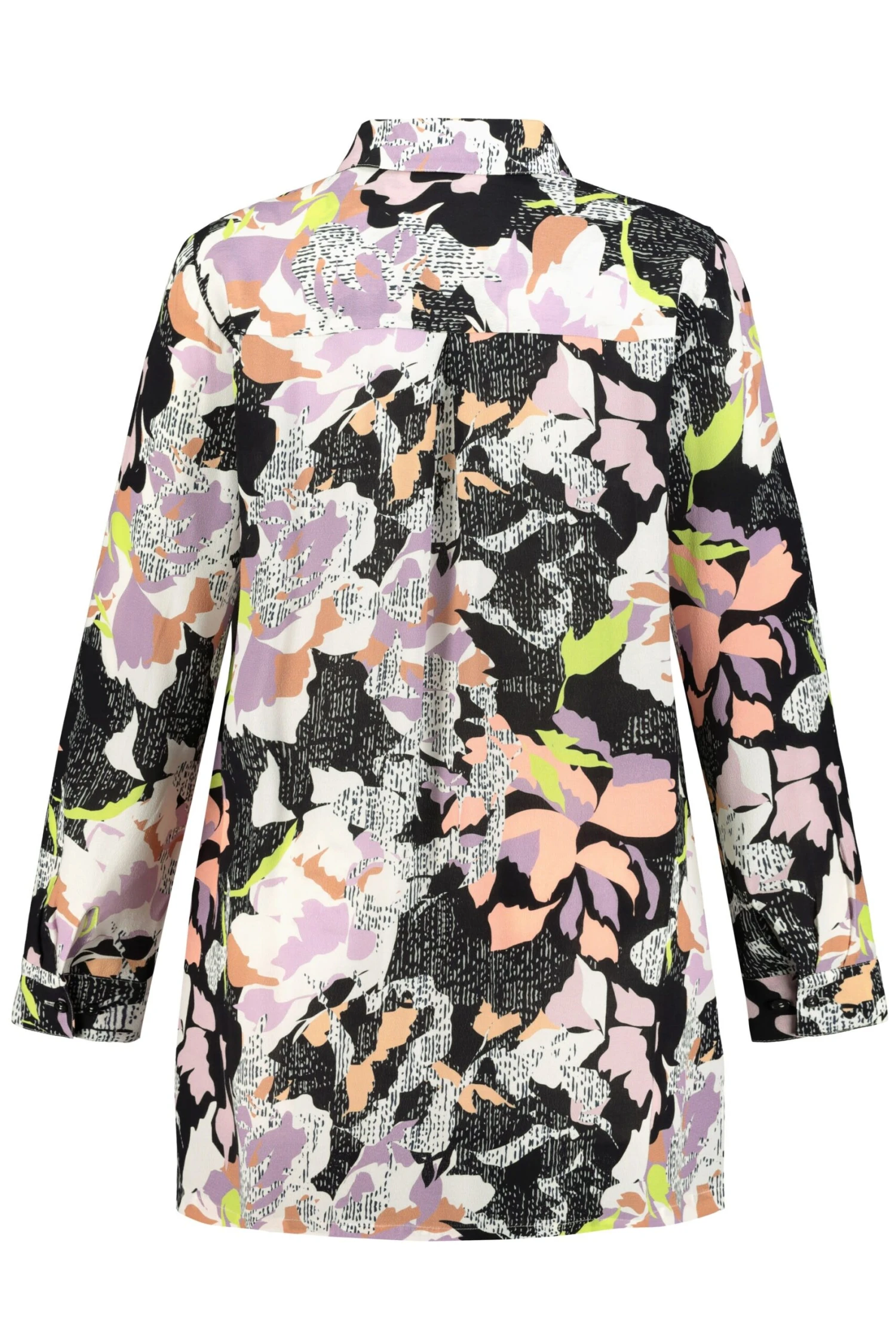 Hemdbluse mit dekorativem Blumenmuster. Hemdkragen, 2 Brusttaschen, leicht gerundeter Saum mit Seitenschlitzen. Langarm mit Manschetten. Passendes Kleid: 781481100.