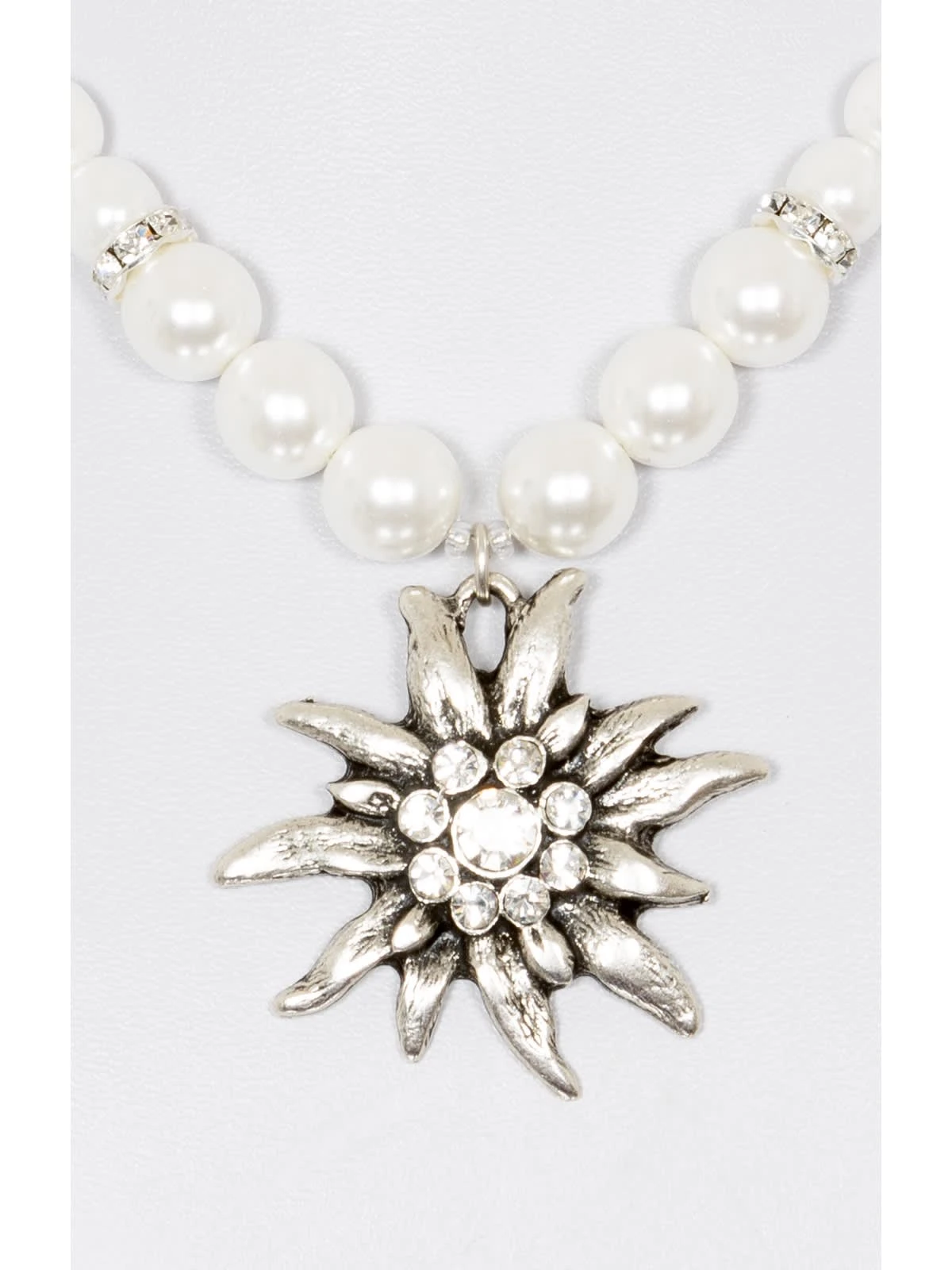 Auffällige Wachsperlenkette mit großem Edelweiß-Anhänger. Mit dieser Wachsperlenkette aus unserem Onlineshop lässt sich jedes Dirndl um einen auffälligen Hingucker bereichern. Die 41 bis 47 cm lange Kette ist aus weißen Wachsperlen und Elementen aus Strass gefertigt. Der dekorative Edelweiß-Anhänger zieht sowohl im Alltag als auch bei Festlichkeiten alle Blicke auf sich.•Trachtenketten •Wachsperlenkette •Alpenwahn